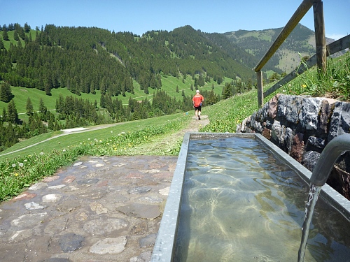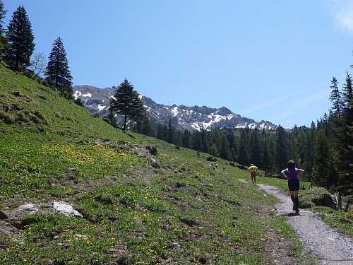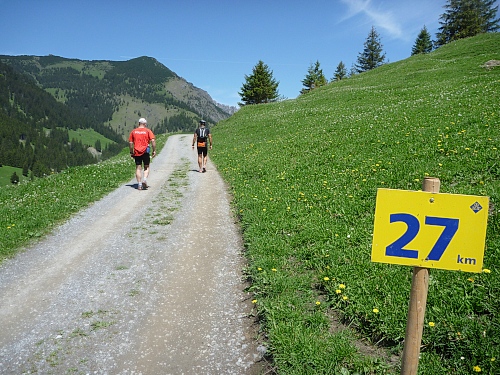 Dreihundert Höhenmeter hinab nach Steg (1303) km 25, im Saminatal, Ziel für die Halbmarathonläufer PLUS. Wer diese Strecke geschafft hat, der hat Startgeld und Kondition gut investiert. Ausblicke auf Alvier, Säntis und im Osten zum Ochsenkopf und Gamsbart und nach Süden zum Valüntal mit Naafkopf, Grauspitz und Falknis.