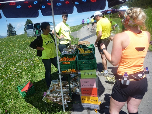 Sassförkle (1771 m) ist ein kleiner Bergübergang von Sass nach Gutschg, dort hinauf führt uns der Lauf über die steile Strecke. Die drei Kapuziner sind Felsköpfe, die ausschauen wie drei Mönche. Das Licht, die Luft, die Freiheit, ja, die Freiheit! Ich lache laut und die Helfer wissen, was ich meine, klopfen mir auf die Schulter, bieten an, Fotos zu schießen. Doch wie kann man dieses alpine Hochgefühl, Krönung eines harten Marathonlaufes wiedergeben?
