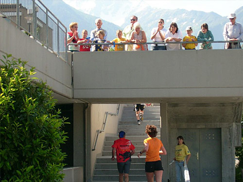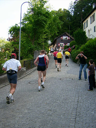 Nochmals ein paar Treppen und wir kommen am Kunstmuseum vorbei. Das Städtle durchlaufen wir unter dem „Heja, heja“ der zahlreichen Zuschauer. Und damit ist für uns das „Einlaufen“ beendet. Denn nach der nächsten Rechtskurve geht es ans Eingemachte - der erste Anstieg beginnt. Zunächst noch in moderater Ausführung bis zum Roten Haus, einem der Wahrzeichen des Hauptortes. Das Gebäude ist ein spätmittelalterlicher Treppengiebelbau, welches 1525 von einem Erben der Vaistlis vom Kloster erworben wurde. Der Turm ist weithin sichtbar und hinter der Grundstücksmauer wird heute Wein angebaut.