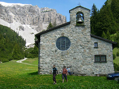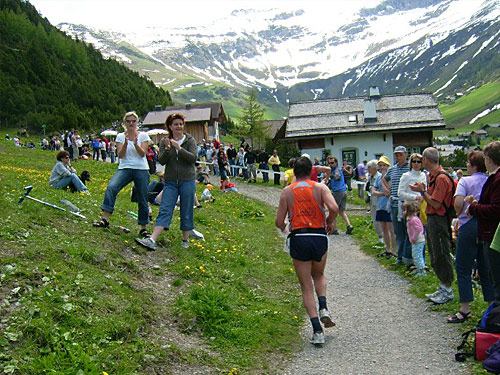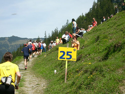 Ein malerischer Wanderweg folgt, Tendenz fallend. Bei Kilometer 36 sehen wir zum ersten Mal das Zielgelände in Malbun. Ein Konkurrent sagt, „gleich sind wir am Ziel.“ Eine entsprechende Warnung auf das kommende kupierte Wegstück wird bei ihm angekommen sein. Bei der Malbuner Friedenskapelle (Kilometer 37) beginnt eine harte Prüfung. In 50 Meter zum Ziel geht unser Weg in ansteigender Form weiter. Unzählige Zuschauer bilden hier eine Gasse und treiben uns hoch. Soweit die Zuschauer am Weg stehen, laufe ich, aber dann ist der Gehschritt wohl effektiver.