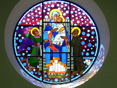 Ich gehe fünfzig Meter hoch Richtung Friedenskapelle. Dort beobachte ich die vorbeiziehenden Läufer und Walker. Es dauert nicht lange, bis der Klaus ankommt. Ich feuere ihn an und gebe ihm noch eine kurze Wegbeschreibung für den Panoramaweg mit. Später schaue ich mir die Friedenskapelle an. Sie wurde 1950/1951 durch den Pfarrer Engelbert Bucher errichtet, als Dank für die Verschonung des Landes im Zweiten Weltkrieg. Ich luge in die Kapelle hinein und entschließe mich, so verschwitzt ich momentan bin, in das Gotteshaus zu gehen, da keine andere Person drin ist. Sehenswert ist das große Rundfenster über dem Altar, das die Gottesmutter Maria mit ihrem Kind und Nikolaus von Flüe darstellt.