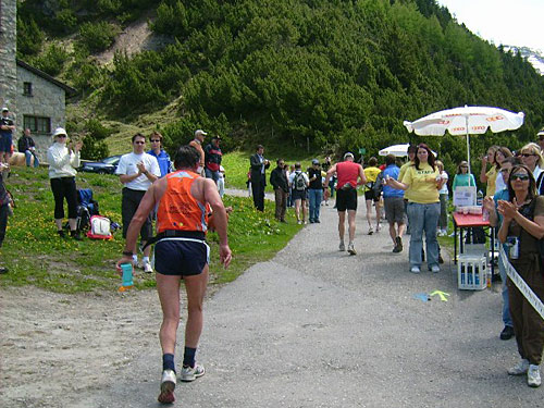 Bei Kilometer 39 befindet sich die letzte Verpflegung. Auf meine Frage, „habt’s a Bier“, sagt ein reaktionsschneller Helfer „hier“. Zwei, drei Schlucke gut gekühlter Gerstensaft schmecken ausgezeichnet. Oberhalb von mir höre ich ein lautes Rufen von einem Tier, es ist ein Marmota marmota malbunus anonymus. Ihr dürft mal wieder raten. Zwei kurze Schneefelder sind auch noch zu bewältigen. Die letzte Steigung ist dann kurz vor Kilometer 40. Ein ruppiges fallendes Wegstück folgt. Konzentration, sonst fliegt man auf die Nase.