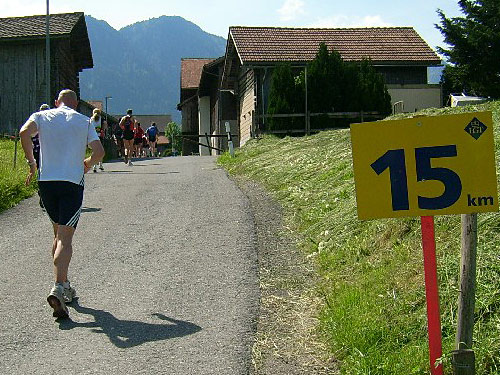 Später erreichen wir Rotenboden und Samina mit Kilometer 15, da gibt’s wieder was für die durstigen Kehlen. Ein Verkehrsschild zeigt eine 15prozentige Steigung an. Bei einer privat betriebenen Wasserstelle bemerke ich, wie gut ein einfacher Schluck Bergwasser schmecken kann. Bei Kilometer 18 laufen wir eben am Hang entlang. Das tut gut, Kräfte sammeln, denn die nächste Rampe kommt bestimmt. Die wartet dann, wo ich zum ersten Mal den Gehschritt einschalten muss. Später lege ich dann wieder den ersten Laufgang ein.