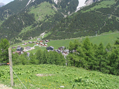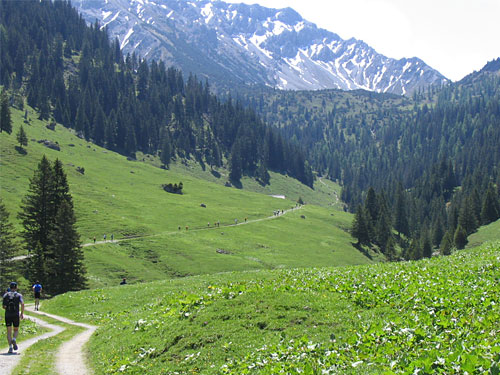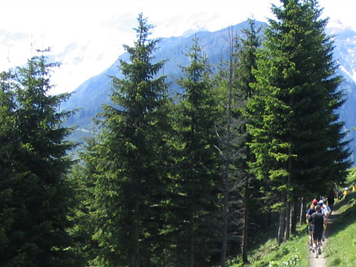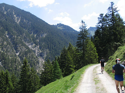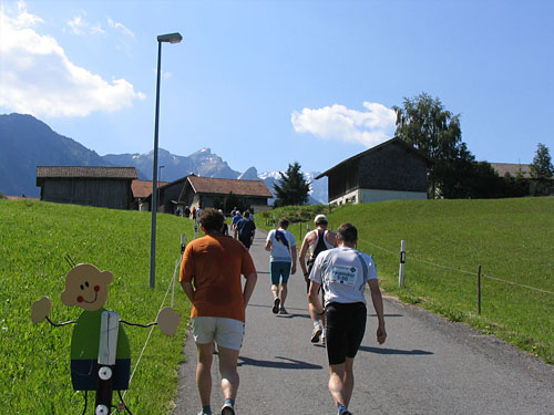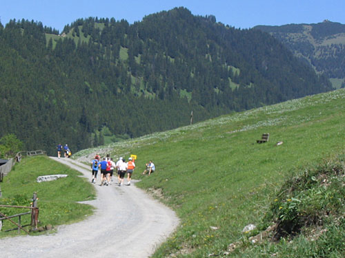 Hier hatte sich das Feld schon ordentlich auseinander gezogen und kurze Zeit später verfiel auch der 5:00 Stunden Zugläufer, dem ich mich angeschlossen hatte, ins Gehen. Mir war im letzten Jahr bei diesem Marathon eindrucksvoll klar geworden, wie sehr sich doch ein Berglauf von einem Lauf im Flachland unterscheidet. Ist bei einem ebenen Rennen in relativ gemäßigtem Tempo ein Einbruch gut vorher zu erkennen, so kommt er am Berg doch überfallartig und ist fast nicht mehr durch langsameres Laufen aufzuhalten. Das war mir 2004 so gegangen. Am langen Aufstieg hatte ich meine Kräfte verpulvert und war dann in der 2. Beraufpassage jämmerlich eingegangen. Das wollte ich dieses Mal besser machen. Der Zugläufer kam mir deshalb sehr recht. So konnte ich mich daran orientieren, wann es galt zu Laufen und wann Gehen angesagt war.