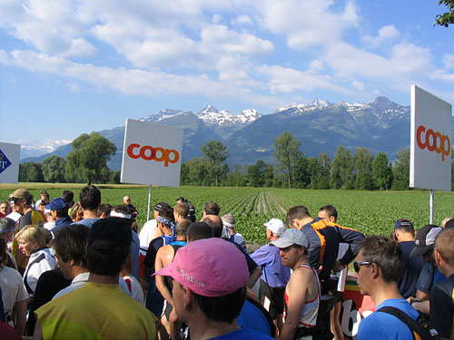 Dermaßen gestärkt, musste man nur 100 Meter gehen um seine Tasche mit der Wechselkleidung und den Duschsachen in Empfang zu nehmen, die man vor dem Start in Bendern bei zwei Lastwagen der Liechtensteiner Post abgegeben hatte. Kaum 200 Meter weiter konnte man sich in dem aufgebauten Duschzelt wieder in einen passablen Zustand versetzen.