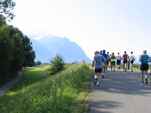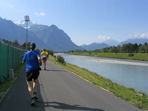 Das Wetter war grandios, der alpinen Szenerie angepasst. Beim Start um 9 Uhr in Bendern zeigte das Thermometer gerade mal 15 ° C, die Tendenz war jedoch durch die strahlende Sonne klar erkennbar. Ich hatte den Lauf vor einem Jahr schon einmal bestritten, wobei ich damals durch einen dauernden Regen nicht soviel Glück mit dem Wetter hatte. Das war auch ein Grund, warum ich dieses Jahr unbedingt den Lauf nochmals machen wollte, obwohl er mir in meinen Terminplan nicht besonders gut passte.