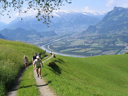 Die Strecke schlängelte sich durch die Bergdörfer und Höfe oberhalb von Vaduz, teilweise auf asphaltierten Wegen, teilweise auf Bergpfaden. Durch üppig grüne Bergwiesen, vorbei an den schönen Gärten in Samina, durch schattige Waldpassagen und mit einem grandiosen Blick auf das Rheintal. Endlich waren wir auf der Silumer Höhe angelangt. Hier gab’s an 2 Verpflegungspunkten, recht kurz hintereinander, das Wichtigste für diesen Tag: zu trinken.