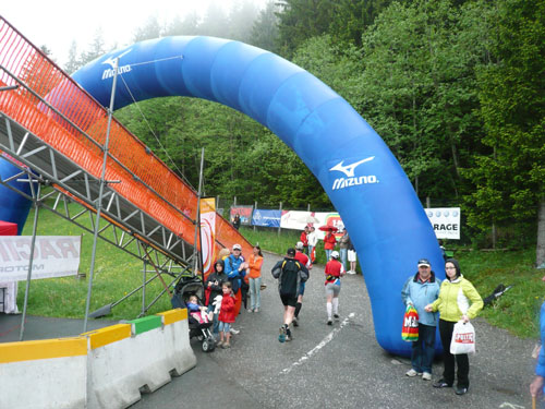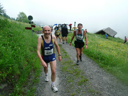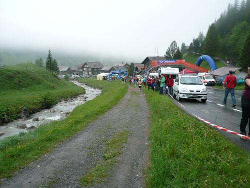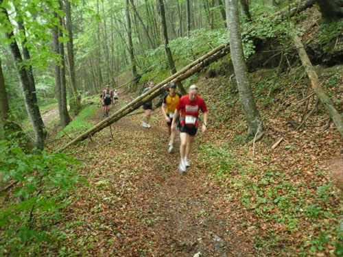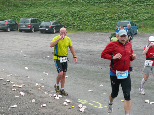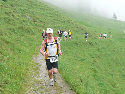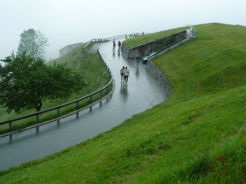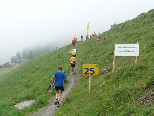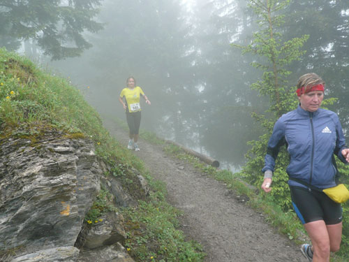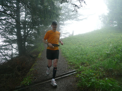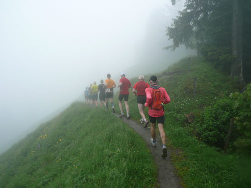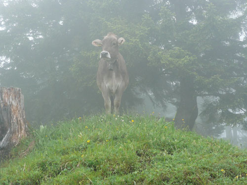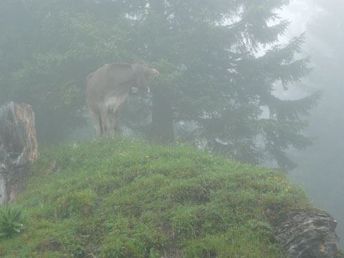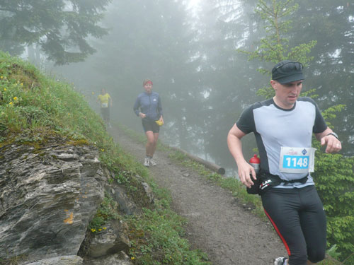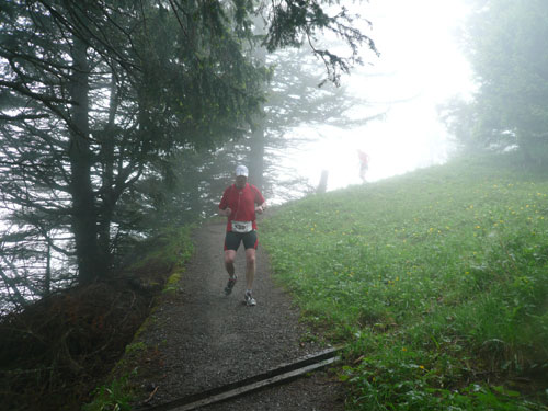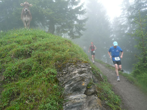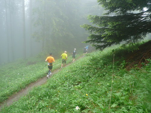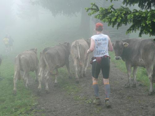 Ab km 26 beginnt der zweite Anstieg der Strecke, anfangs noch mit kürzeren Flach- und auch gelegentlichen Bergabstücken. Bis Saasförkle auf 1.796 Höhe sind wieder 500 Höhenmeter zu bewältigen. Zum Sehen gibt’s leider bis auf das kurze Stück Wegstrecke vor einem, eigentlich nichts mehr. Die einzige optische Abwechslung zum dicken Nebel bieten mir einige Kühe, die unseren Weg kreuzen und ich daher schon fast als Highlight auf meine Speicherkarte banne. Wenigstens hat es aber aufgehört zu regnen. Obwohl mein Shirt wahrscheinlich einen Liter Wasser aufgenommen hat, ist es in kürzester Zeit wieder fast trocken. Eigentlich habe ich ja ein Ersatzshirt in meiner Gürteltasche, den Wechsel kann ich mir jetzt aber sparen. Heftig zur Sache geht es auf dem Abschnitt von km 32 bis zur Verpflegungsstelle am Saasförkle bei km 35. Ein steiler Singletrail führt uns im Gänsemarsch mit einer Sichtweite von vielleicht 20 – 30 m nach oben. Meine Oberschenkel nehmen das nicht gerade wohlwollend zur Kenntnis.