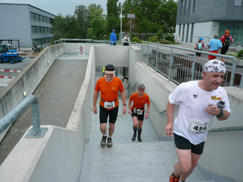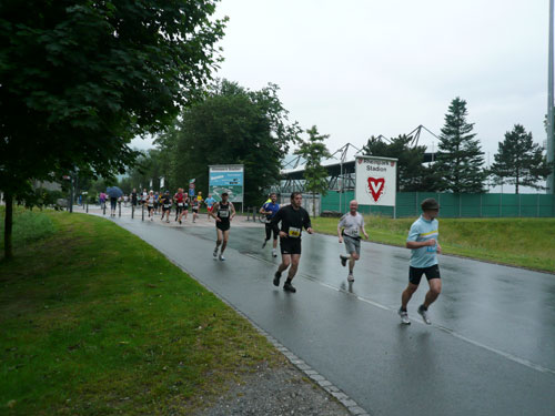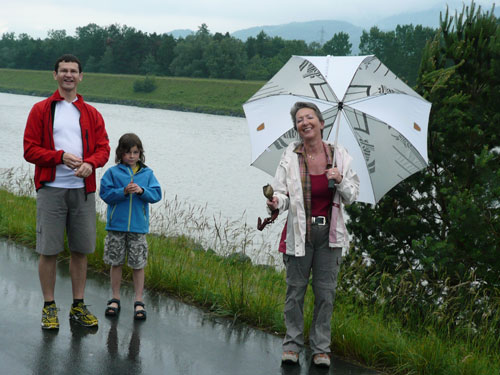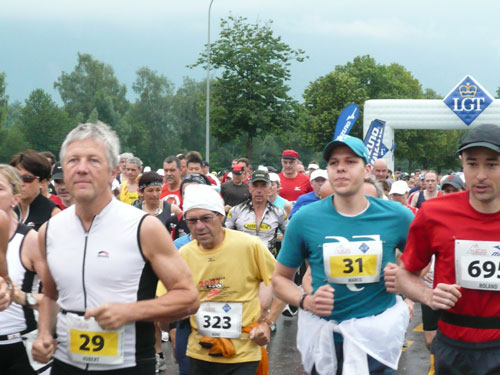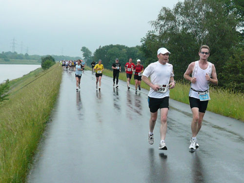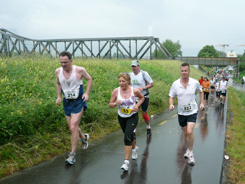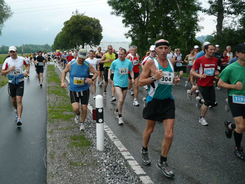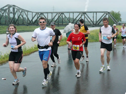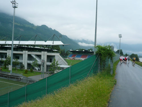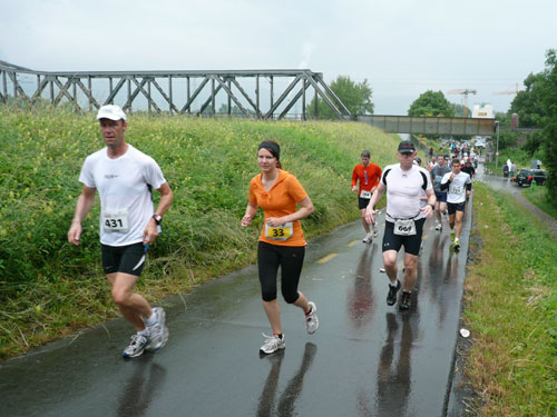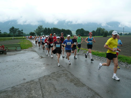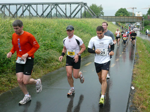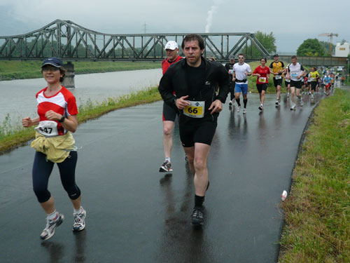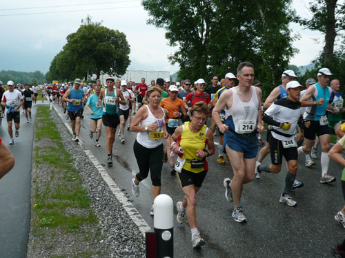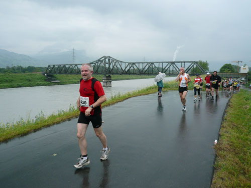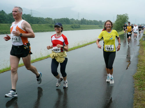 Die ersten flachen 10 Kilometer dienen zum Warmwerden. 1,5 km legen wir auf der Schaaner Landstraße zurück, dann geht’s rechts ab, runter an den Rheindamm. Erst noch unterhalb des Walls, nach 5 km dürfen wir dann rauf mit Sichtkontakt auf den unten fließenden Rhein, der auch die Grenze zur Schweiz darstellt. Anfangs tröpfelt es noch mit Unterbrechungen aber bald fängt es schon richtig zum regnen an. Bei km 6 spricht mich Marianne an: Ist den Klaus heute nicht da? Den treffe ich sonst immer hier. Heute muss sie mit mir vorlieb nehmen, Klaus sorgt für fotografische und vielleicht ja auch seelische Unterstützung einer ganzen m4y-Autoren-Armada in Biel.