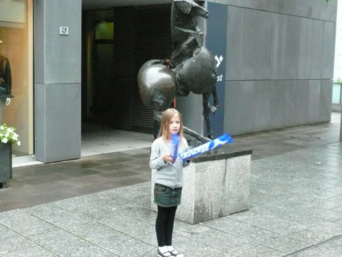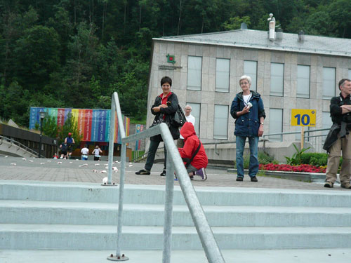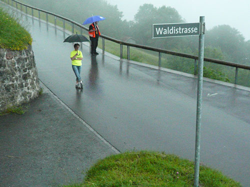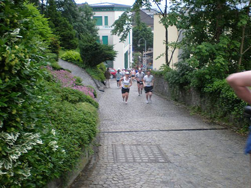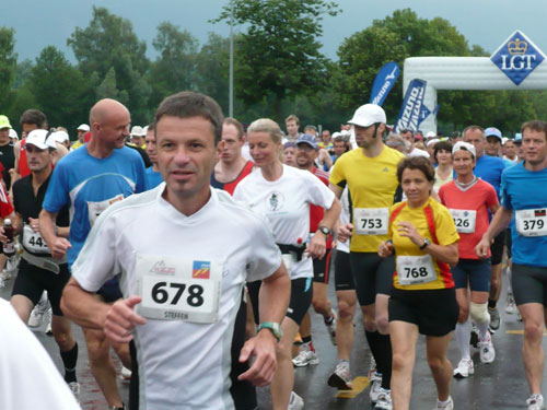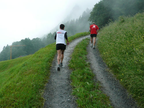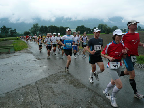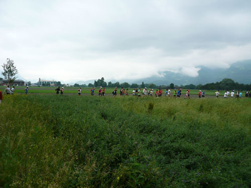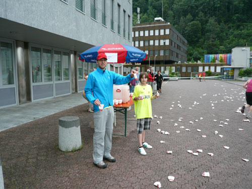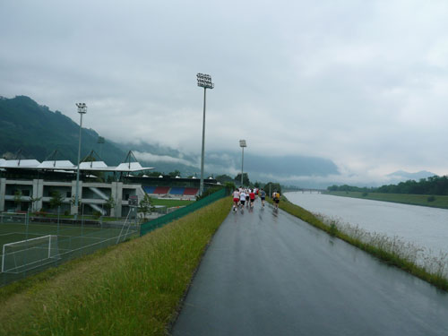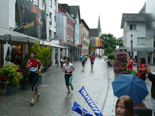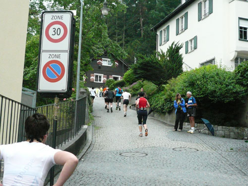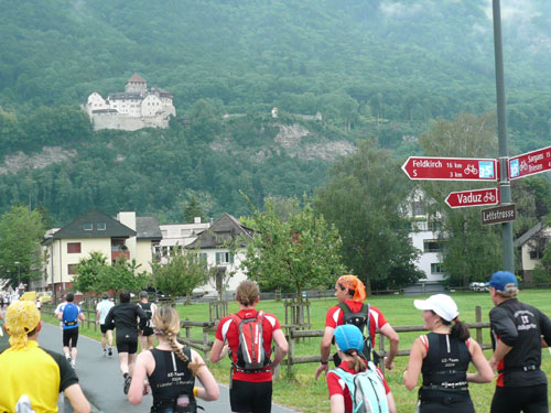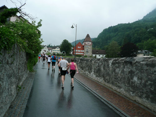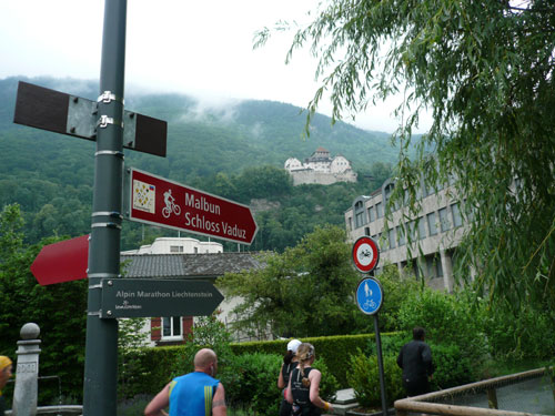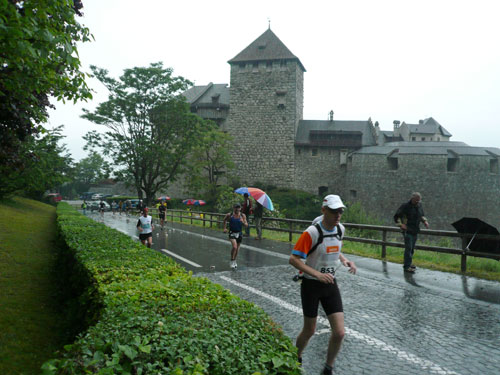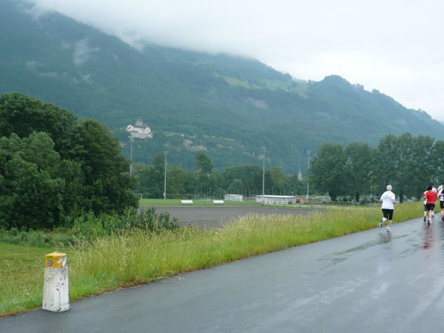 Über einige Treppenstufen geht’s hinein ins „Städtle“ Vaduz. Gerade mal 5.000 Einwohner zählt der Hauptort des kleinen Fürstentums. Insgesamt wird das „Ländle“ von 35.000 Menschen bewohnt, davon sind ein Drittel Ausländer. Hauptsächlich Schweizer, Österreicher, Deutsche und Italiener. Amtssprache ist Deutsch und bezahlt wird in Schweizer Fränkli, natürlich werden auch Euros genommen. Erst durchqueren wir noch die Fußgängerzone mit einigen jugendlichen Anfeuerern, aber dann ist es auch schon vorbei mit dem Einlaufen, der erste saftige und lange Anstieg beginnt.