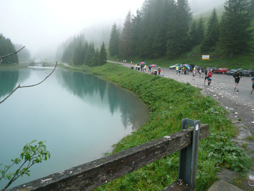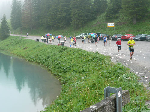 Bis zum Saminasee geht es auf den nächsten 3,5 km tendenziell abwärts, aber nicht durchgehend. Es gibt auch mal flachere Stücke und kleinere Anstiege, aber endlich wieder eine andere Belastung für die Beine. Am See erwartet uns eine weitere V-Stelle und kurz darauf haben die Halbmarathon PLUS-Läufer kurz nach dem 25-er Schild ihr Ziel erreicht. Für uns geht es schon vorher rechts ab, wieder einen Anstieg hoch. Nur für kurze Zeit lichten sich die Wolken etwas und geben mehr von der Landschaft preis.