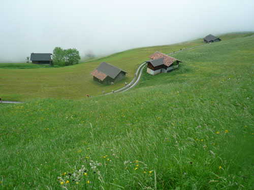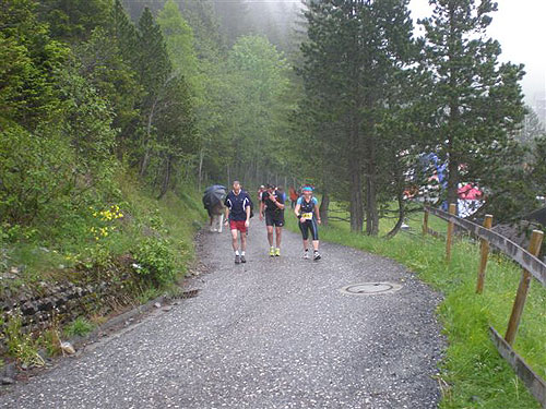 Aber dann müssen wir doch wieder raus aus dem schützenden Gehölz auf die Fahrstraße. Für meine Kamera habe ich aber vorsichtshalber ein Plastiktütchen mitgenommen und in die verschwindet sie dann auch für die einige Zeit. Die Waldistraße führt uns wieder in rustikaleres Terrain. Die Berge sind leider vollkommen verhangen und immer wieder kommt für meinen Geschmack deutlich zuviel Nass vom Himmel. Mein Shirt klebt mittlerweise nur noch an mir und wäre eher geeignet für eine Teilnahme an einem Wet-T-Shirt-Contest. Orientierung und Aufnahme von Landschaftseindrücken sind leider vollkommen Fehlanzeige. So hätte ich mir meine erste Bergtour in diesem Jahr eigentlich nicht vorgestellt.