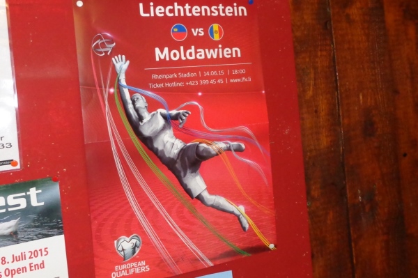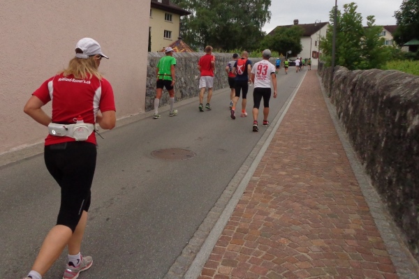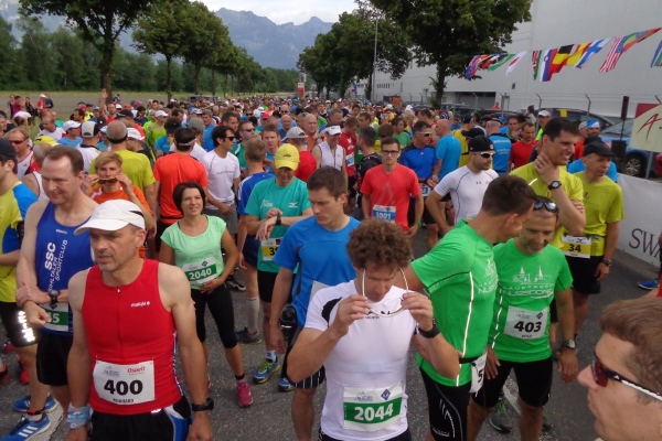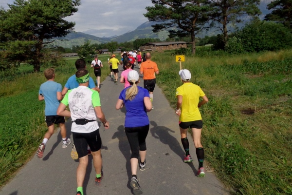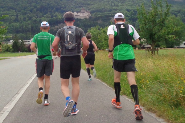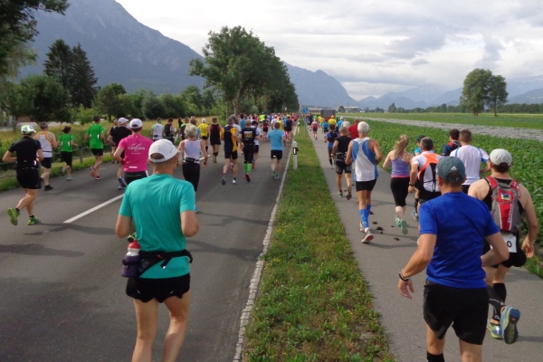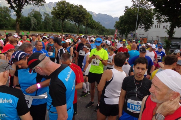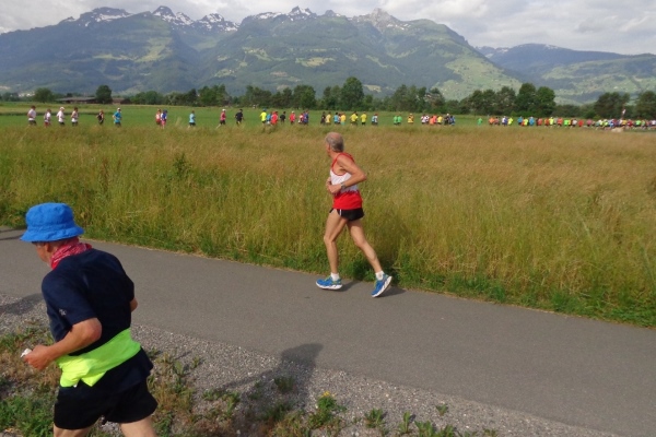 Countdown zum Start, um 09h00 geht es bei Sonnenschein los. Bruttozeitnehmung, denn am Start gibt es keine Zeitkontrolle. Erst einmal geht es schnurgerade und flach los, nach anderthalb km in rechtem Winkel rechts weg, zwischen Feldern durch direkt auf den Rhein zu (440m). Da biegt die Strecke links ab, Bäume und Sträucher spenden Schatten. Bei km5 die erste Labe und dann geht es rauf auf den Damm, wir sehen den Rhein. Das linke Ufer gehört zur Schweiz, wir laufen am rechten Ufer nach Süden auf Vaduz zu. Ein angenehm kühler Wind weht. Monika freut sich auf die Berge, das Laufen in der Ebene ist ihre Sache nicht. Die Strecke führt uns am Rheintalstadion vorbei. Morgen werden da die Nationalmannschaften von Liechtenstein und Moldawien ein EM-Qualifikationsmatch austragen. Heute wird da trainiert.