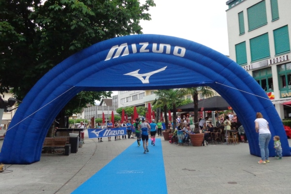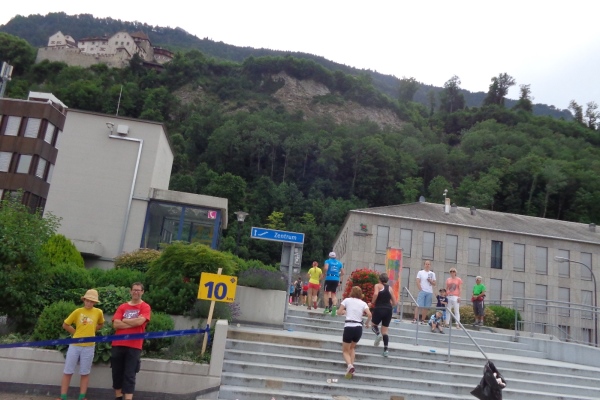 Dann geht es ein paar Treppen rauf, die nächste Labestelle und 10km sind geschafft. 58min bis hierher. Wer da schon länger als 70min unterwegs ist, für den ist das Rennen hier zu Ende. In der Fuzo laufen wir am Landesmuseum vorbei, da ist gerade eine Marilyn-Monroe-Ausstellung. Unmittelbar daran das Post- und Briefmarkenmuseum und gleich vis-à-vis das gestern von uns besichtigte Kunstmuseum mit der Hilti Art Foundation.