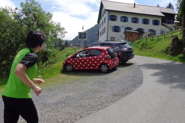An der linken Straßenseite geht es bald hunderte Meter nahezu senkrecht runter, ich halte mich rechts. Ein wunderschönes Bergpanorama tut sich auf. Ein frischer Staffelläufer überholt mich, und ist bald entschwunden. Dann habe ich die Strecke weitgehend für mich alleine. Ein Geländewagen mit „Samariter“-Aufschrift kommt mir entgegen, er ist im Einsatz.
