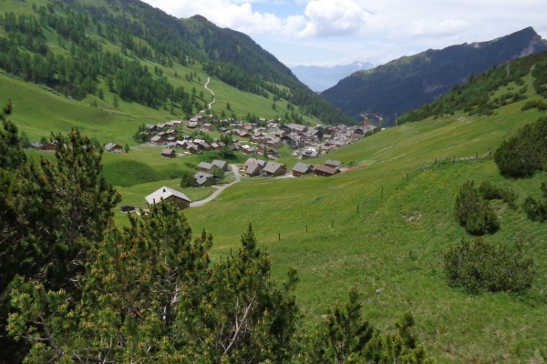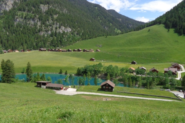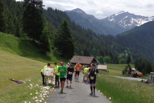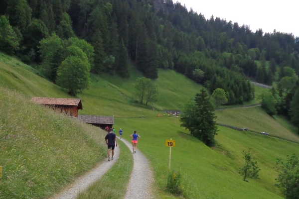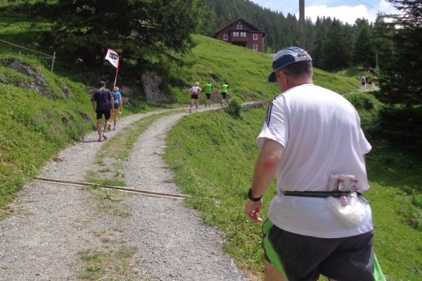 Unter uns liegen in herrlichem smaragdgrün zwei kleine Seen. Wir nähern uns Steg, 25km, auf 1.303m. Ich fülle meine Flasche auf. Dann ist da das Ziel des „Halbmarathon Plus“ sowie Staffelwechsel (LGT-Staffel 25+17). Für Marathonstarter, die erst nach 4 Stunden hier eintreffen, ist das Rennen in Steg zu Ende. Vreni kommt nun hier vorbei. 15x steht auf ihrem Shirt. Wenn eine diese Strecke kennt, dann Vreni.