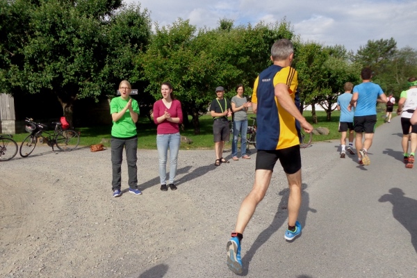 Vor km31 stärke ich mich an einer gut sortierten Labestelle, 2km geht es leicht ansteigend weiter. Wolken ziehen am Himmel, so scheint manchmal die Sonne, dann ist es wieder bewölkt, ein ziemlich ideales Wetter haben wir heute.