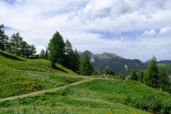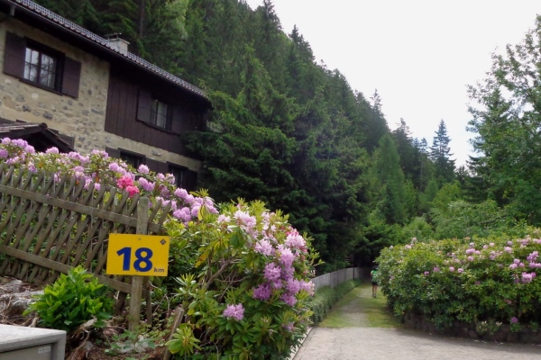 Zwischen km18 und km19 können sich unsere Waden erholen, da geht es flach dahin. Dann wird es wieder ernst, die Almhütten werden mehr, einige der Bergwiesen sind frisch gemäht, andere stehen noch in voller Blüte. Jaroslav ist meine Gewichtsklasse. Etwa 100kg? „105, meine Frau kocht wie eine Weltmeisterin“, erklärt er mir.