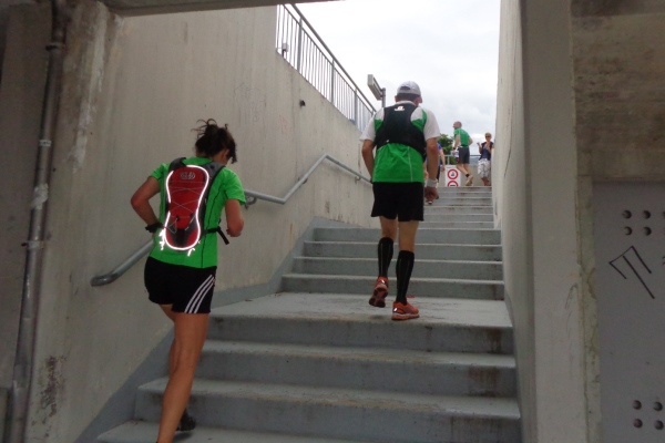 Längst wandern hier alle, laufen tut keiner mehr. Seine Kräfte einteilen ist gefragt. Die üppig bestückten Labestellen werden gerne genommen. Schon bald gibt es Coca-Cola, Power-Riegel, Energie-Beutelchen, Obst, Wasser und Sponser-Iso. Hin und wieder schlage ich nach einer Bremse in den Kniekehlen, drei erwische ich. Joachim spricht mich an, das M4Y-Shirt fällt auf!