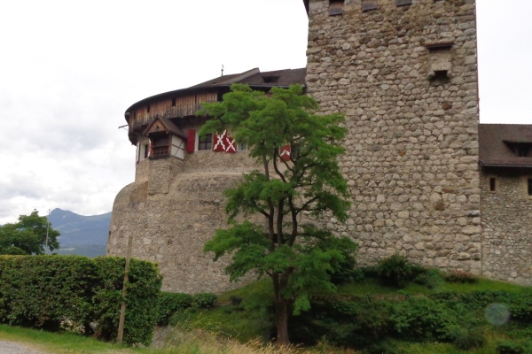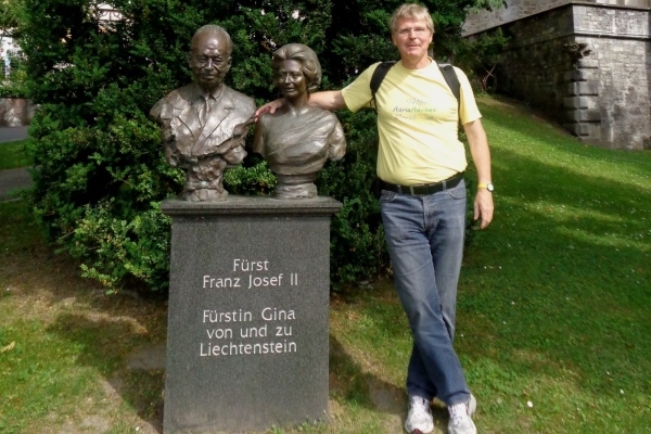 Nun unter dem blauen Mizuno-Bogen durch, wo wir eifrig angefeuert werden. Dann geht es gleich zackig bergwärts. Ein paar Hektar Weingärten hat Liechtenstein auch. Die Menge ist bescheiden, die Qualität der Weine soll ganz ausgezeichnet sein. Bevor man vergebens zum fürstlichen Schloss rauf steigt, wird man hier informiert, dass eine Besichtigung des Schlosses nicht möglich ist. Der Fürst wohnt da nämlich mit seiner Familie.