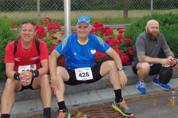 Hände schütteln mit Pierre Convert samt Entourage, der seine Marathons oft filmend und kostümiert absolviert, heute ist er auf ernsthaft unterwegs. Hannes Kranixfeld treffe ich wieder, der hat schon da und dort einen Marathon gewonnen. Dieses Wochenende macht er drei Marathons in drei Ländern an drei Tagen, gestern ist er in Biel gelaufen, morgen läuft er im Donautal. Habe d’Ehre!