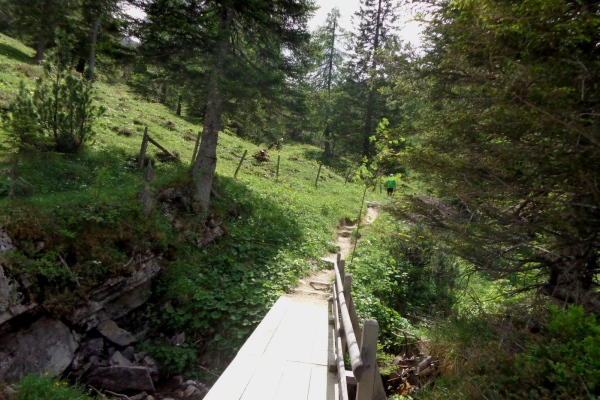 Dann wird es steil, aber so richtig! Unter Ausnutzung der Latschen-Wurzeln als Trittstufen geht es nun 2km lang stetig hoch, die Enziane am Wegesrand werden immer mehr, die Trollblumen auch. Es freut mich, dann auf einer Forststraße vier Damen bei einem Versorgungsposten anzutreffen, eine Oase! Mit Cola stärke ich mich. „Bis zum höchsten Punkt sind es noch 700m!“ Na, das ist doch eine Ansage.