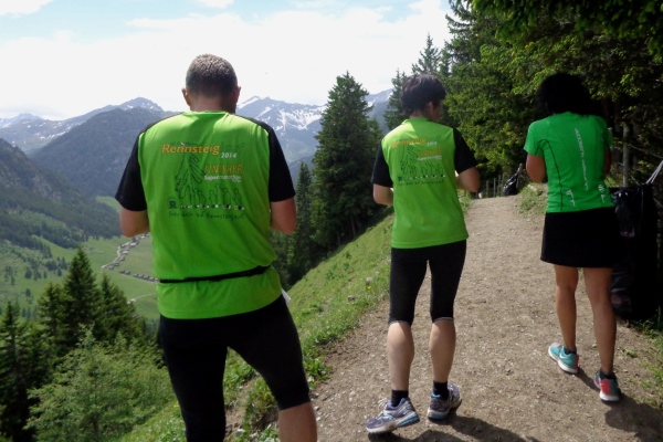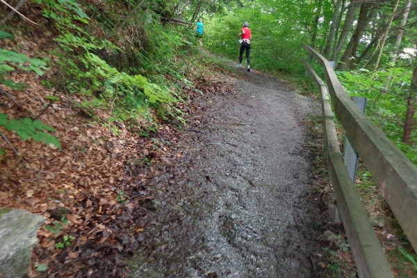 Bei km21 laufe ich an Andrea vorbei, wir sind 3 Stunden auf der Strecke. Andrea (Chefin des Zermatt Marathon) ist die 6-Std-Zugläuferin. Es geht rauf bis 1.539m. Noch vor km22 geht es auf losem Untergrund steil bergab, und schmal, da vergeht mir das Knipsen. Dann wird es flacher und breiter, hier kann ich gut laufen. HaWe kann es noch besser und überholt mich da. Sein gelbes Shirt kündet vom nächsten PUM (= Piesberg-Ultra-Marathon) im April 2016.