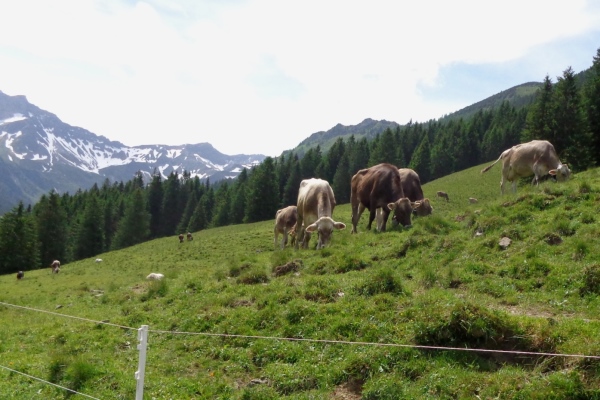 Nach einem kleinen Hügel geht es auf einer Forststraße in leichtem Anstieg weiter. Erst einmal an einer Kuhherde vorbei, das Gebimmel der Kuhglocken hat etwas Friedliches. Die Drehkreuze, damit die Kühe auf ihren Weiden bleiben, wurden für die Läufer entfernt. So muss man sich nicht durchschlängeln.