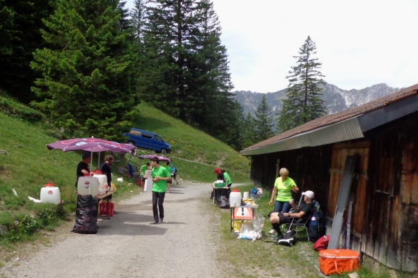 Links die Berggrate markieren die Grenze zu Österreich. Kurz vorm Kulminationspunkt liegt in einem Kar sogar noch etwas Schnee. Das gelbe 15x-Shirt unmittelbar vor mir, komme ich zum Sassförkle auf 1.771m. Die Besatzung des Versorgungspostens da hat frischen Wind und einen ganz fantastischen 360°-Blick. Außerdem alles Mögliche zu essen und zu trinken, bis hin zur salzhaltigen Bouillon.