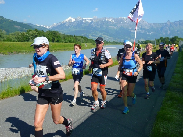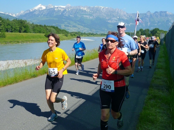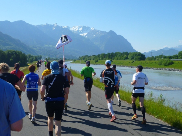 Judith und ich haben uns als Trail-Anfänger keine besondere Taktik zugelegt. Wir wollen den Lauf einfach genießen und haben vor, entsprechend dem Tipp von Klaus Duwe einfach auch mal Gehpausen einzulegen. Daher ordnen wir uns bei Andrea (Zermatt-Marathon-Chefin), der Sechs-Stunden-Pacemakerin, ein. Schon nach zwei Kilometern sind wir direkt am Rhein und kurz danach auf dem hohen Rheindamm. Auf der anderen Seite liegt schon die Schweiz. 160 km² sind nicht wirklich viel Liechtenstein. Nachdem es hier nicht so viel geregnet hat, führt der Fluss nur wenig Wasser. Es ist angenehm zu laufen und die Spannung auf das, was uns noch erwartet, steigt.