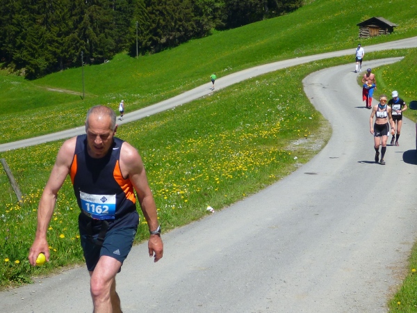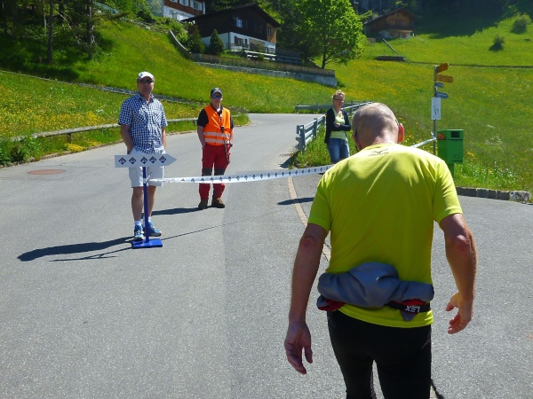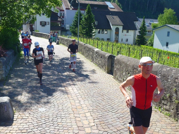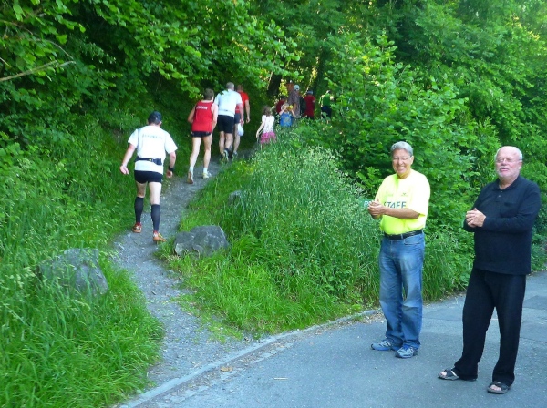 Wenn man mal den Zwang zu laufen überwunden hat, kann man den wunderbaren Blick auf das Rheintal und die Berge genießen. Ich liebe es, wie mit dem Höhengewinn immer neue Berggipfel am Horizont auftauchen. Richtung Schweiz sind da wirkliche „Riesen“ auszumachen. In puncto Aussicht haben wir einen guten Tag erwischt. Mir kommen die Berichte aus den Jahren vor 2011 in den Sinn. Regen und Nebel. Ist sicher auch ein Abenteuer, aber schönes Wetter ist mir lieber. Und es sind viele Zuschauer unterwegs. Mir ist es ein bisschen peinlich, dass wir als „Wanderer“ so angefeuert werden. An diesem Hang gibt es viele Weiler und Dörfer. Wer hier wohnt, genießt die schönen Ausblicke das ganze Jahr.