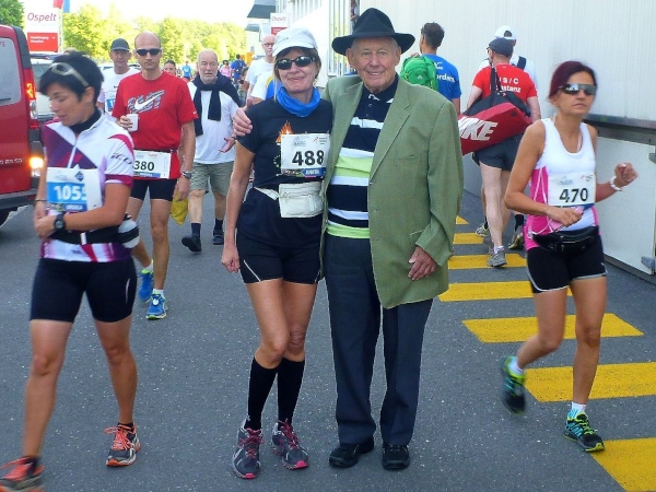 Um 7:30 Uhr ist es am Startgelände in Bendern (nördliches Liechtenstein) schon angenehm warm. Viele Läuferinnen und Läufer holen erst heute in der Kantine der Fleischfabrik („Mal besser. Malbuner“) ihre Startnummern ab. Es handelt sich um einen Familienbetrieb, der 1957 von Herbert Ospelt („Onkel Herbert) gegründet wurde und inzwischen auch Werke in Deutschland betreibt. So haben wir sicher schon alle einmal Fertigpizza aus der Ospeltschen „Anstalt“ gegessen. Anstalt ist hier übrigens die Bezeichnung für eine Rechtsform. Auf dem Parkplatz erkennen wir dann Onkel Herbert sofort an der für ihn typischen Kopfbedeckung, dem Borsalino, und nutzen die Gelegenheit für ein Erinnerungsfoto. Immerhin hat er ein Imperium mit mehr als 2000 Mitarbeiterinnen und Mitarbeitern und einem Jahresumsatz von 650 Millionen Euro aufgebaut. Mein Vater ist dagegen mit seinen drei Blumengeschäften schon 1965 baden gegangen.