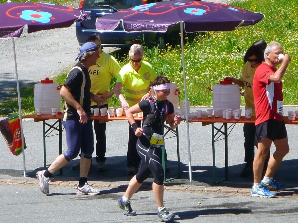 Bei der zweiten Verpflegungsstelle sind wir bereits im Zentrum mit vielen neuen und schicken Verwaltungsgebäuden und Museen. Außerdem ist hier der Punkt 0, von dem aus alle Straßenkilometer im Fürstentum gezählt werden. Im „Städtle“ direkt unterhalb des Schlosses sind viele applaudierende Zuschauer. Leider sind die Fotos aus der kleinen Kamera wegen zu viel Licht und Schatten nicht vorzeigbar.