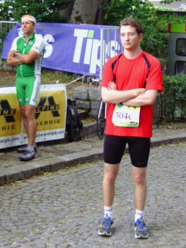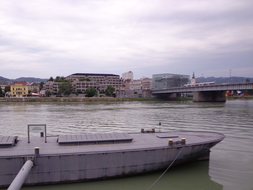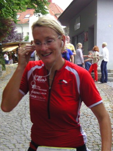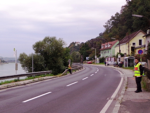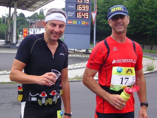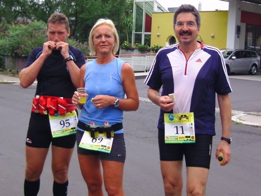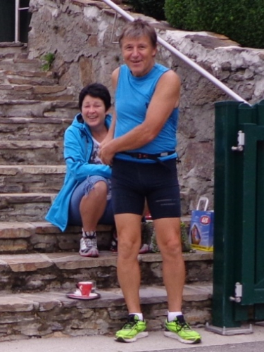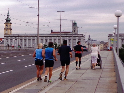 Linz - St.Magdalena. Ein schöner Blick auf Linz. Den Marienberg runter bis zur Leonfeldner Straße. Etwa km26 und Wechsel auf den zweiten Staffelläufer. Margot, Staffel-Startläuferin und somit für heute schon fertig, kommt mir entgegen gelaufen und will wissen, wie es mir denn geht. Evi will das auch wissen und bietet mir Magnesium an, es ist 11h57. Genau so spät war es, als ich vor vier Jahren hier vorbei gekommen bin. Cola, Wasser, Cola, Iso, etwas Salzgebäck, Wasser und verdünntes Cola in die mitgebrachte Flasche.