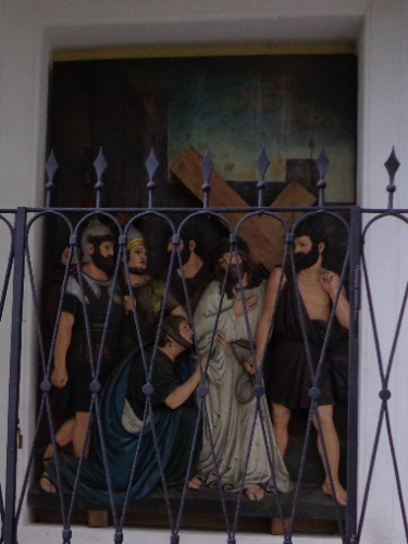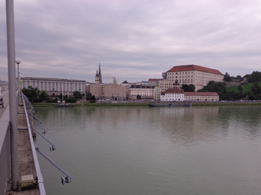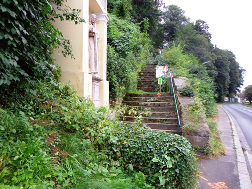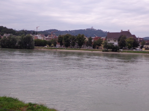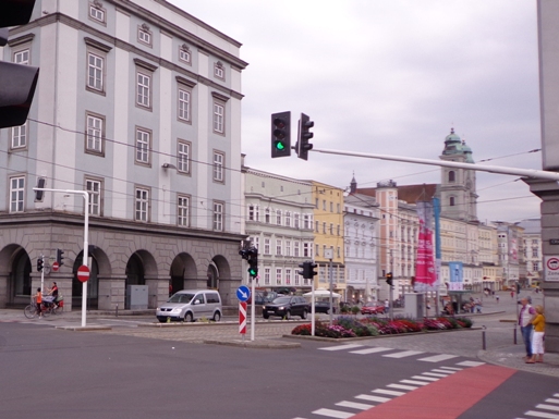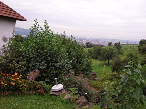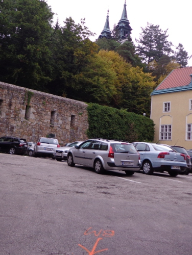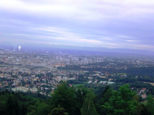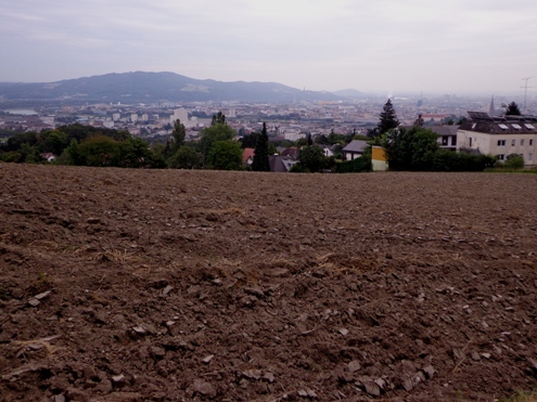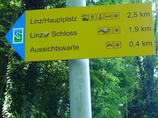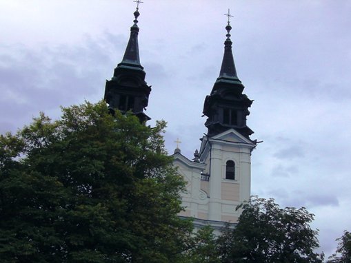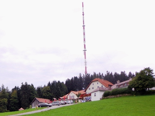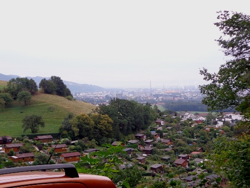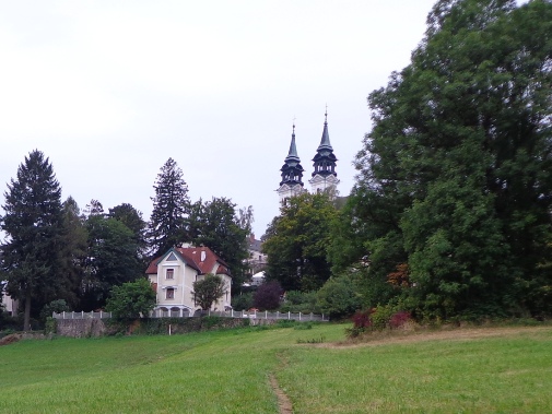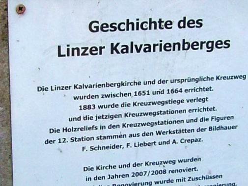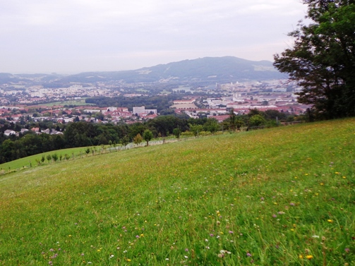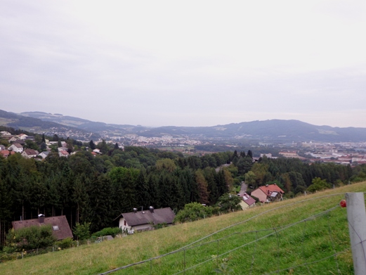 Unversehrt bin ich auf der asphaltierten Straße angekommen. Tempo. Vor dem Anstieg (ca. 350m ü.d.M.) nun der 3. SKP, fast muss ich mich anstellen. Der Ausblick den der Bergbauer hier hat ist schon erstklassig. Man sieht rüber auf den Pfennigberg. Die Schafe sind weg, die Gänse und Pferde sind da, er selber ist auf Urlaub, steht am Tor. Wanderer fragen mich, was wir hier tun und können es gar nicht fassen als sie es hören. Durch ein Wäldchen sehe ich bald die Pöstlingbergkirche (512m ü.d.M.) über mir. Wohl die beliebteste Hochzeitskirche im Raum Linz. Außerdem Wallfahrtskirche und Pilgerstätte, innen in Barock und Rokoko, 1774 fertig gestellt. Aber noch bin ich nicht oben.