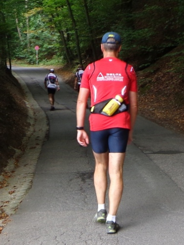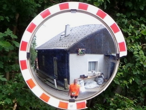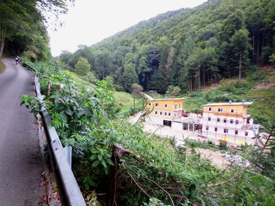 Der zweite Teil geht gleich fast senkrecht los, kommt mir vor. Also 16% sind stellenweise. Das hat den Vorteil, dass man ziemlich schnell Höhe gewinnt, mit dem Auto! Ein paar schöne Häuser gibt es hier oben und ausgebaute Bauernhäuser. Mittlerweile habe ich Gesellschaft bekommen, Lieven ist wieder da. Nach 3km endet der Asphalt, es geht ein Stück auf einen Waldweg. Als der Lichtenbergsendemast schon recht Nahe aussieht, spüle ich mein mitgebrachtes PowerGel runter.