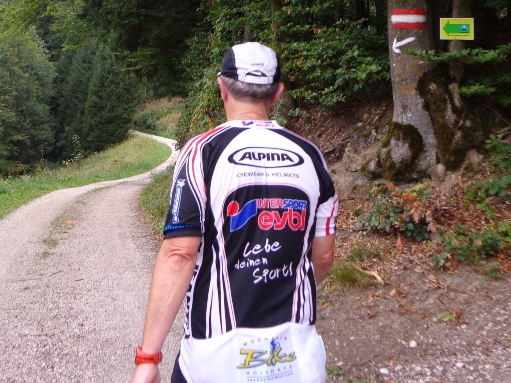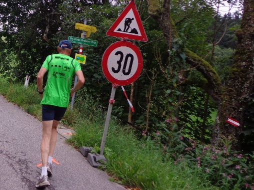 Ein kühler Wind weht. Als ich mich auf den Weg hinunter machen will, kommen Vroni, Franz und Günther. Ich bin überrascht, die drei habe ich vor mir vermutet. Ein kleiner Erfahrungsaustausch, ein paar Fotos. Ich muss weiter, mir wird kalt. Wir sehen uns später. Am Weg hinunter wird das Geläuf sehr uneben. Der Weg erinnert mehr an ein ausgetrocknetes Flussbett, faustgroße Steine und frei liegende Wurzeln. Wieder am Asphalt kann ich endlich wieder etwas fürs Tempo tun.