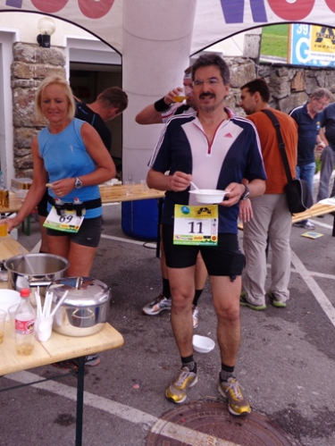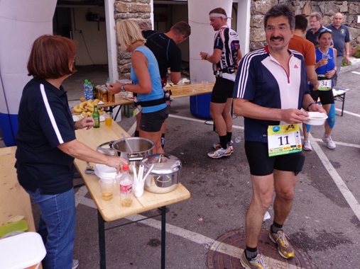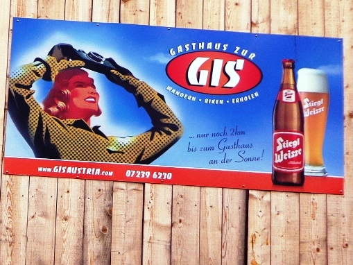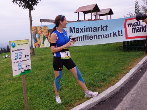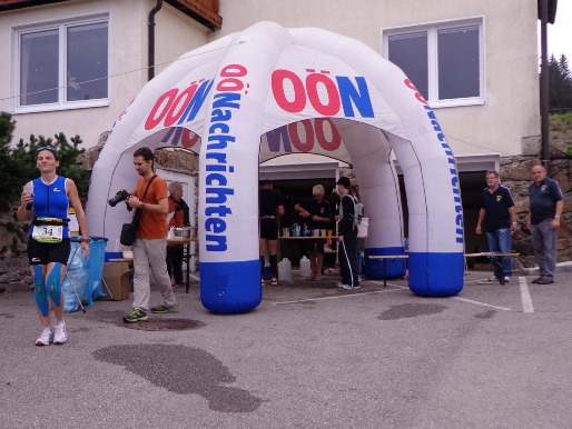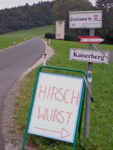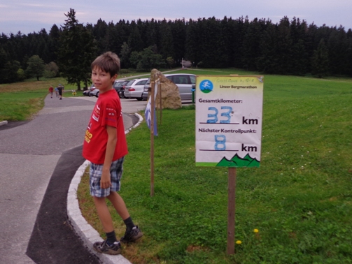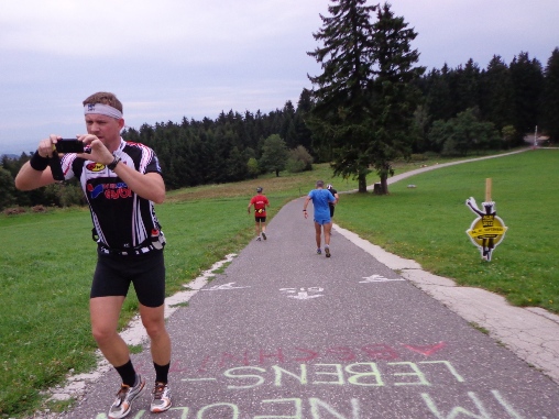 Km 33, Gasthof zur Gis – ich habe den höchsten Punkt der Strecke erreicht. Sieglinde und Roman begrüßen mich. Ein äußerst beliebter Ausflugspunkt bei den Linzern. Ist an der Donau Nebel, ist hier oft Sonne. Hat es im Winter Schneematsch in der Stadt, ist hier oben tiefster Winter. Ist es in der Stadt heiß, kann man hier entspannt auf der Terrasse sitzen und übers Alpenvorland in die Alpen blicken. Das Alpenpanorama ist legendär. Und hier gibt es heute die begehrte Nudelsuppe für die Läufer. Natürlich auch sonst alles was das Herz begehrt, sogar Magnesium in Pulverform.