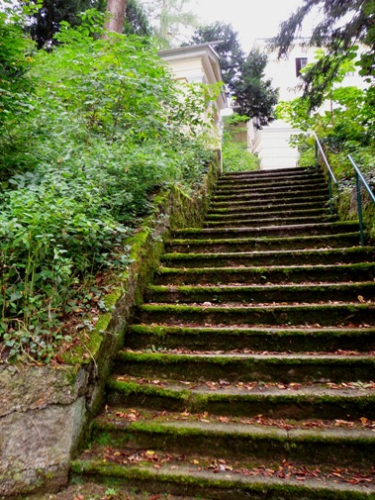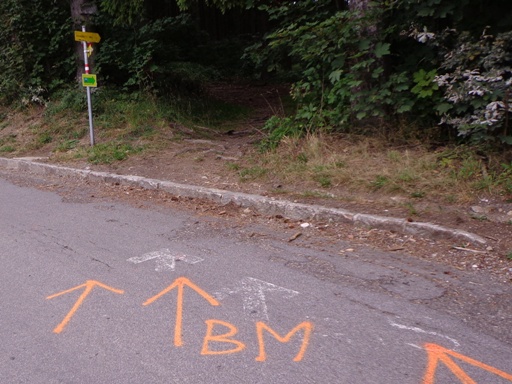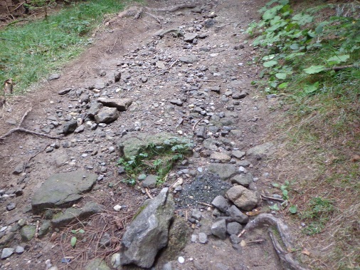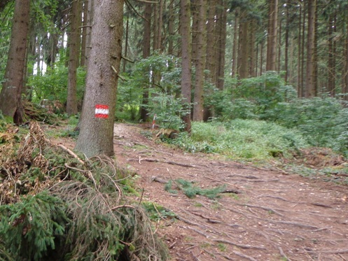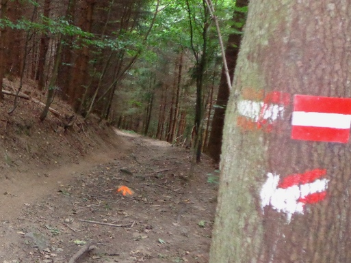 Nun kommt das für mich gefährlichste Streckenstück. Der Übergang vom Schmiedgraben in den Dießenleitenweg. Wie vorhin: faustgroße Steine und viele frei liegende Wurzeln, tief hängende Äste, ab und zu geht es auch bergauf. Vor 6 Tagen war ich zuletzt hier, heute komme ich mit dem Boden viel besser zurecht. Ob es am reichlich getankten Zucker liegt? Einige der herausragendsten Wurzeln oder Steine sind mit Signalspray markiert.