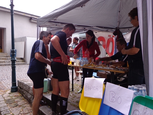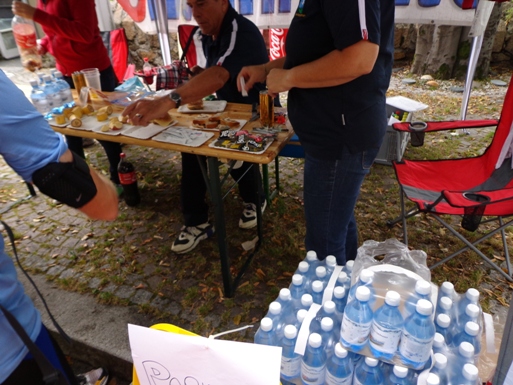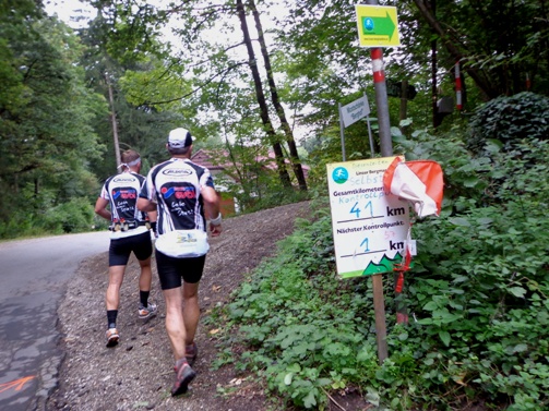 In Zinngießing gibt es kurz Asphalt. Der zweite SKP und das nächste Loch in der Startnummer ist fällig. Weiter auf einer Forststraße, vorbei an Kakteen und Oleander. In der nächsten Siedlung gibt es wieder eine voll ausgerüstete Labestelle mit jungen Betreuern. Flasche nachfüllen, ausreichend trinken, Iso-Riegel, Banane. Ich schwitze wie verrückt, zum Glück ist es nach wie vor bewölkt. Mein flaues Gefühl von der ersten halben Stunde ist wie weg geblasen. Lieven füllt seinen Camelbag auf.