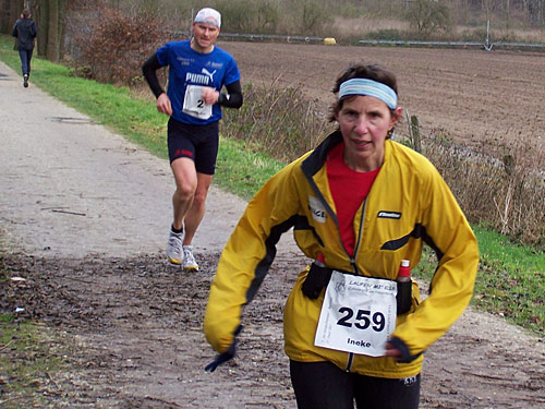 Von mir nicht ganz unerwartet präsentierte sich Sabine (die im Jahr 2004 mit einer Zeit von 9:54:00 Stunden 8. der Deutschen Meisterschaft im 100-km-Lauf geworden war) in einer für diese Jahreszeit beachtlichen Form. Sabine gelangte nach 3:50:30 Stunden ins Ziel und nahm mir mit dem ihr eigenen ästhetischen Laufstil "satte" 1¾ Stunden ab. Wenn mich jemand nach meiner Leistung befragte, umging ich eine klare Antwort, indem ich vom hervorragenden Abschneiden meiner Mitfahrerin Sabine berichtete.