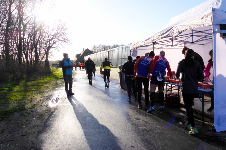 Eigenverpflegung ist eigentlich nicht nötig, es gibt alle 3 Km Verpflegung, wobei der Honigkuchen zu empfehlen ist. Schon am Start liegt er in leckeren Stückchen aus, Wasser und Tee sind mundgerecht aufgewärmt, als hätte Mama nochmal das Fläschen mit der Wange gecheckt. Es ist der erste Marathon in diesem Jahr, den ich ohne Rucksack laufe. Da fühle ich mich wie die Performance-Künstlerin Milo vor dem Kölner Hauptbahnhof.