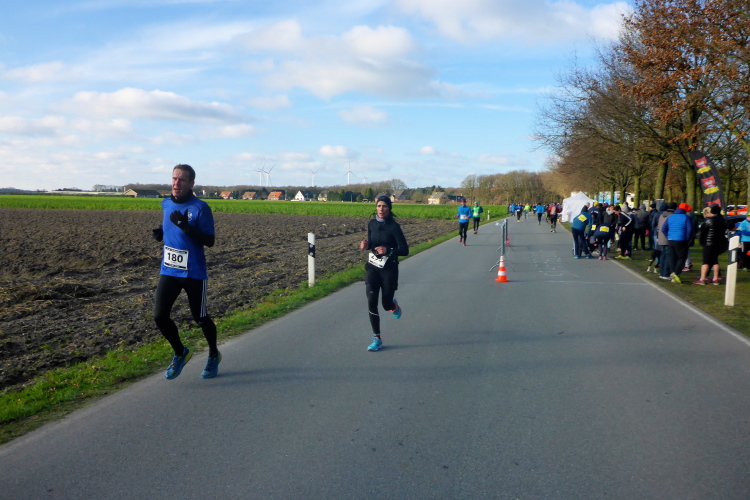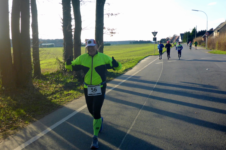 So geht es dann in die zweite Runde. Wir laufen wieder vorbei an einzelnen Gehöften mit Pferde- und Ziegenweiden. Entsprechend ländlich ist der Geruch, typisch Niederrhein halt. Immer wieder werde ich angesprochen, was den Lauf für mich sehr kurzweilig macht. Eilig hat es außer den Spitzenkräften niemand. Kein Wunder, offiziell gibt es keine Sollzeit. Der Lauf ist vorbei, wenn der Letzte im Ziel ist.