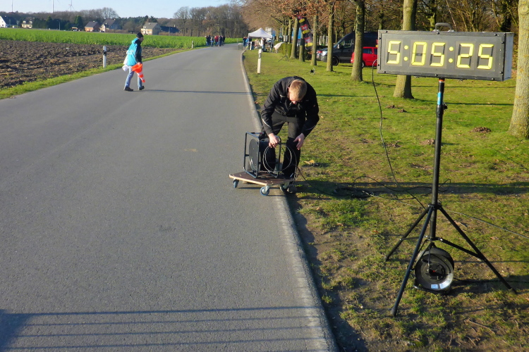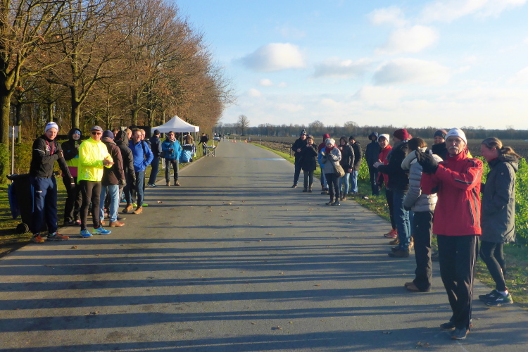 Nach 1,5 km biegen wir scharf links ab und laufen parallel zur Deutsch/Niederländischen Grenze. Nach einem weiteren Kilometer erreichen wir das Gartencenter, vor dem eine Verpflegungsstelle aufgebaut ist. Hoch im Kurs steht heute süßer, warmer Tee. Das Wetter ist mit 3 Grad und teilweisem Sonnenschein fast optimal. Jedoch lässt der für den Niederrhein typische Wind die gefühlte Temperatur unter Null sinken. Aber da haben wir in Kevelaer schon viel schlechtere  Bedingungen gehabt und auch immer überstanden.