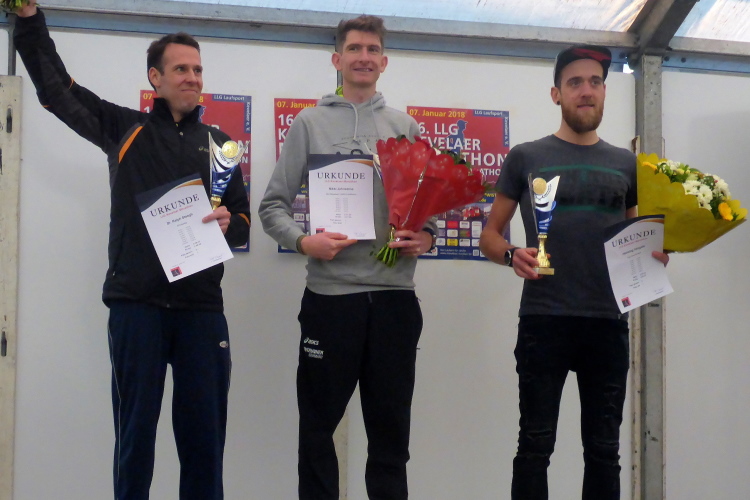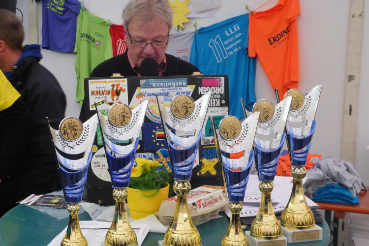 Als ich mit meiner lieben Inge und unserer Freundin Christiane das Festzelt betrete, gilt es viele Hände zu schütteln und gute Wünsche für 2018 auszutauschen. 8 Läufer waren bei allen 16 Veranstaltungen dabei und bilden somit einen elitären Klub. Christian Mai gehört dazu und hat die Startnummer 1. Er wird heute seine Vereinsfreundin Sabrina bei ihrem ersten Marathon begleiten.