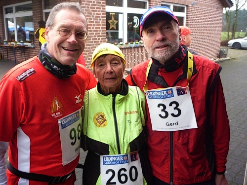 Aber das Beste am Neuen sind die Alten: Gerd Papcke, Jg 1933 ist der erste Finisher der Klasse M80 in Kevelaer. Horst Preisler, Jg 1935 (über 1700 gelaufene Marathons) “läuft” langsam aber stetig. Siegrid Eichner, Jg 1940 (über 1600) läuft absolut klasse, wird ihrem Namen “Sturmvogel” gerecht. Sie wird dieses Jahr wieder am Trans Gaule teilnehmen. Hans-Joachim Meyer Jg 1939 (über 1200) hat etwas Probleme seit seinem Skiunfall. Friedrich Hinkel, Jg 1940 ist der schnellste der “Alten” mit 4:38, dicht gefolgt von Hans Kleinekoort, Jg 1939 aus den Niederlanden. Mir geben diese Junggebliebenen sehr viel!