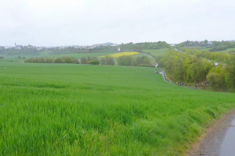 Mit dem Wendepunkt bei Kilometer 11 kommen wir recht nahe an den alten Wingersberg. In der Grube Zieglowski war ich oft an Wochenenden. Es war zu einer Zeit, als es noch nicht diesen Marathon gab. Das ist heute die 36. Austragung. Ich suchte damals nach dem tiefblauen Hauyn. Das ist ein wunderschöner, glasklarer, knapp ein Zentimeter großer Kristall, der nur an zwei Plätzen auf unserer schönen Erde gefunden wird. Zunächst hatte ich meine Funde auf Mineralienmessen verkauft, es gab 20 bis 50 Mark.