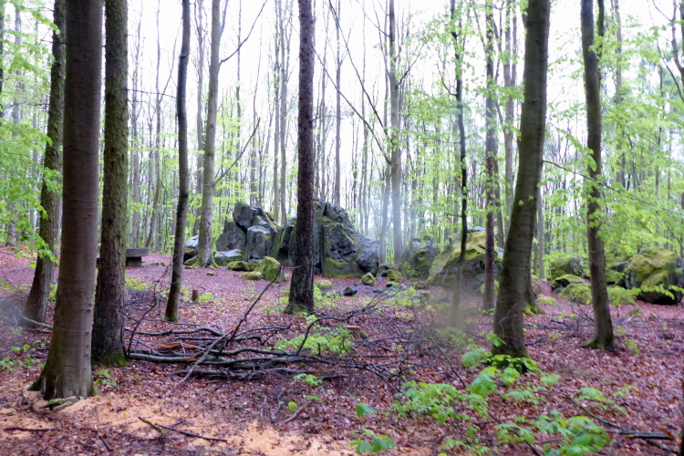Die Streckenführung ist etwas verwirrend, aber perfekt markiert. Zusätzlich stehen den ganzen Tag Helfer im Regen, sodass man nicht aus Versehen falsch laufen kann. In diesem Regen hebe ich den Kopf und entdecke ein wundersames Graffiti auf einem Basaltschlot. Solche Schlote sind Ausbrüche, die unterhalb der Erdoberfläche stecken geblieben sind und nun durch die Erosion freigelegt wurden. Es ist eine Zeichnung, die 1935 zur 400 Jahresfeier von Junker Schilling graviert wurde. Ein Junker ist ein Adliger ohne Ritterschlag. Dieser Junker hatte seinen gesamten Wald verschenkt, wohl aus Angst vor dem Ausbruch des Vulkans.