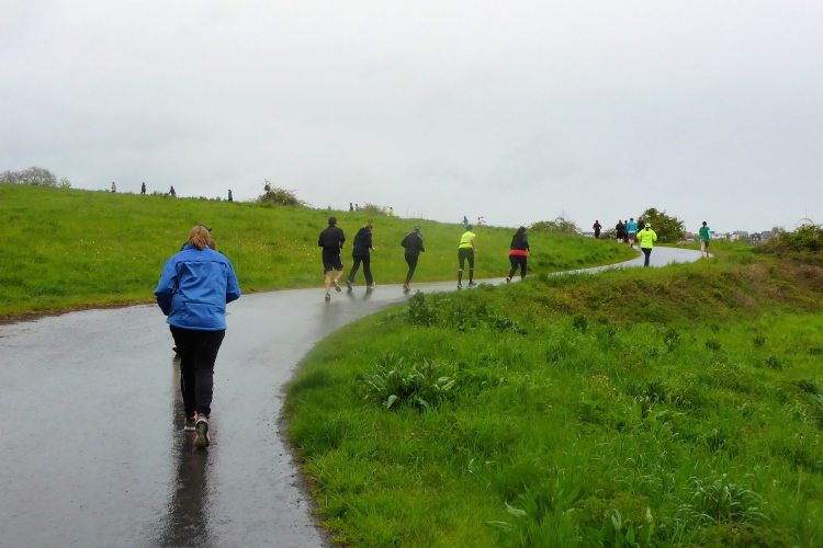Dann holt mich ein Typ mit Fahne ein. Bald drauf höre ich wieder Schritte hinter mir: „ Welche Strecke lauft ihr?“ „ 10 Kilometer Walking“ und schon brausen die Typen vorbei. Es gibt auch Stöckchenschwinger irgendwo auf der Strecke. Mit einem lauten „Vorsicht“ verschaffe ich mir Respekt, das klappt wunderbar. Ich bin kein militanter Gegner von Stöckchenschwingern und Kurzstrecklern, meine Bemerkungen sind väterlich fürsorglich gemeint. Ich bedanke mich brav, wenn sie mich vorbeilassen.