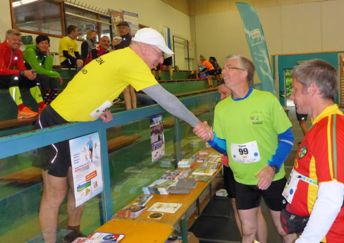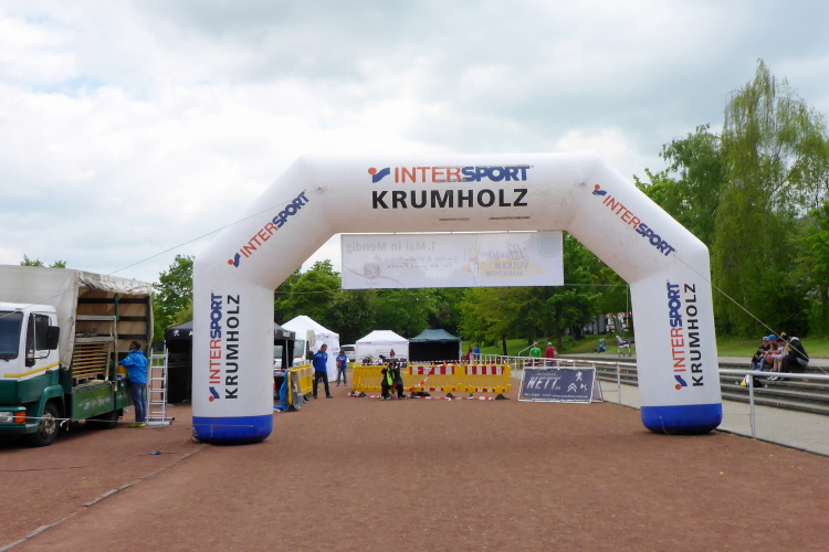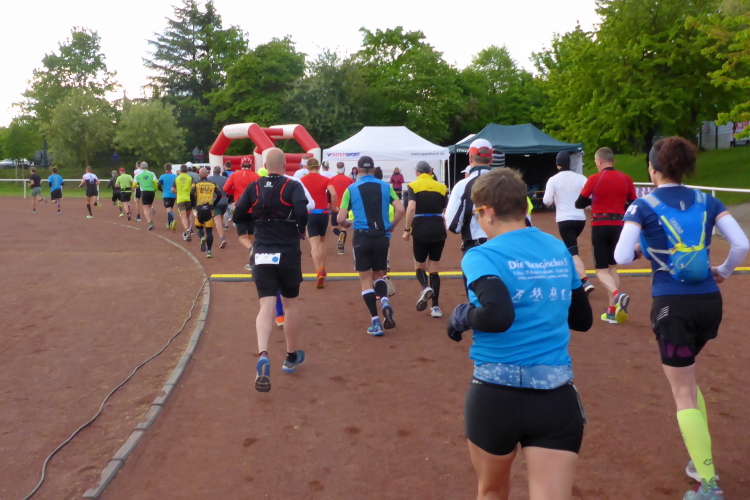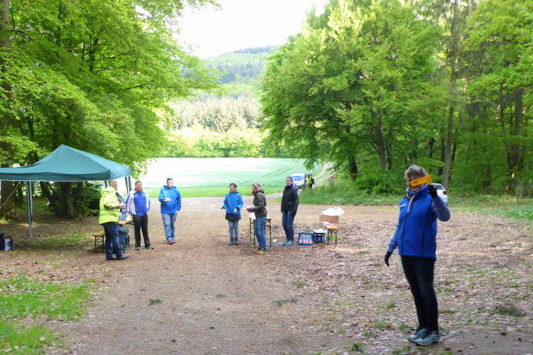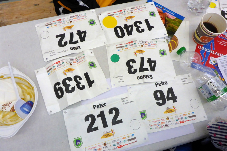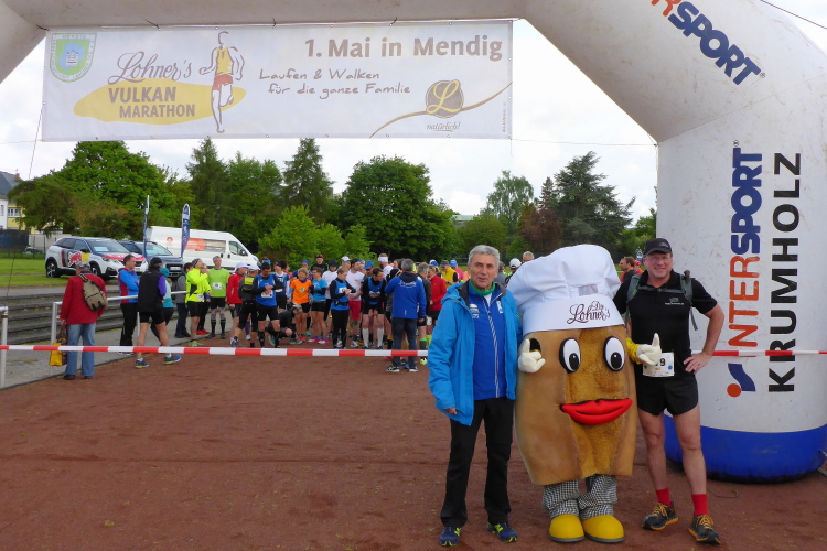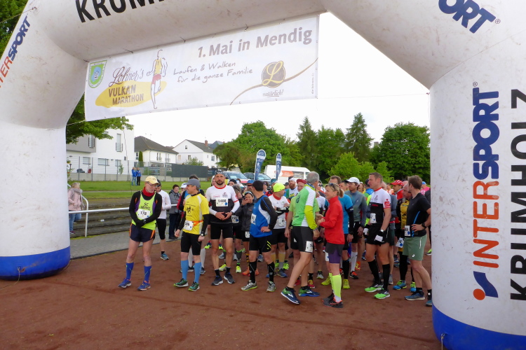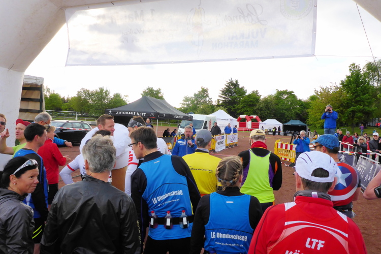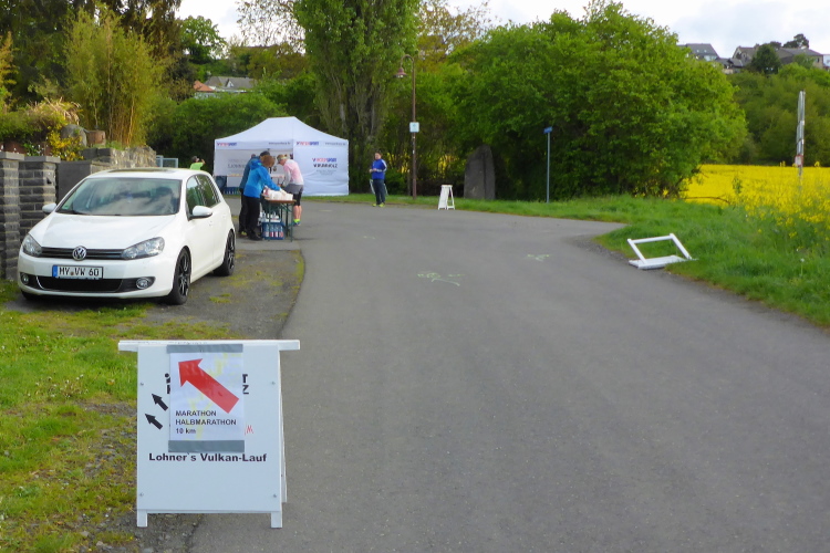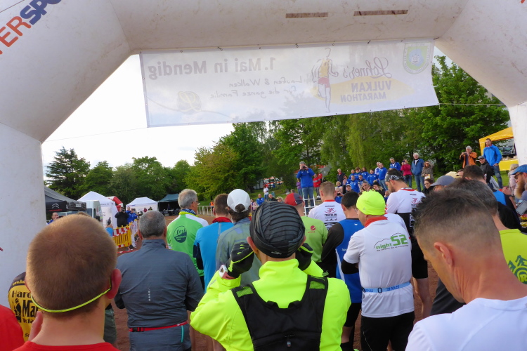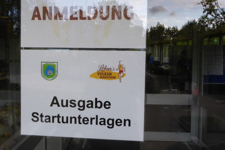 Helfer weisen mich auf einen Parkplatz auf grüner Wiese, direkt am Startort. Noch ist nicht viel los, die 1500 Kurzstreckler dürfen ausschlafen und sich vom Tanz in den Mai erholen. Deswegen ist die Sporthalle noch relativ unbelebt. Auch ich bin noch verschlafen. Gut, dass mir bei der Startnummernausgabe geholfen wird. Sogleich hole ich mir das Brot vom Namenssponsor Lohners Bäckerei und beiße rein. Sehr gut! Ein anderer Sponsor, die Vulkanbrauerei, bietet erst später köstliche Produkte an. Deren Kraft-Biere liefern Power und ungefilterten Gaumenschmaus.